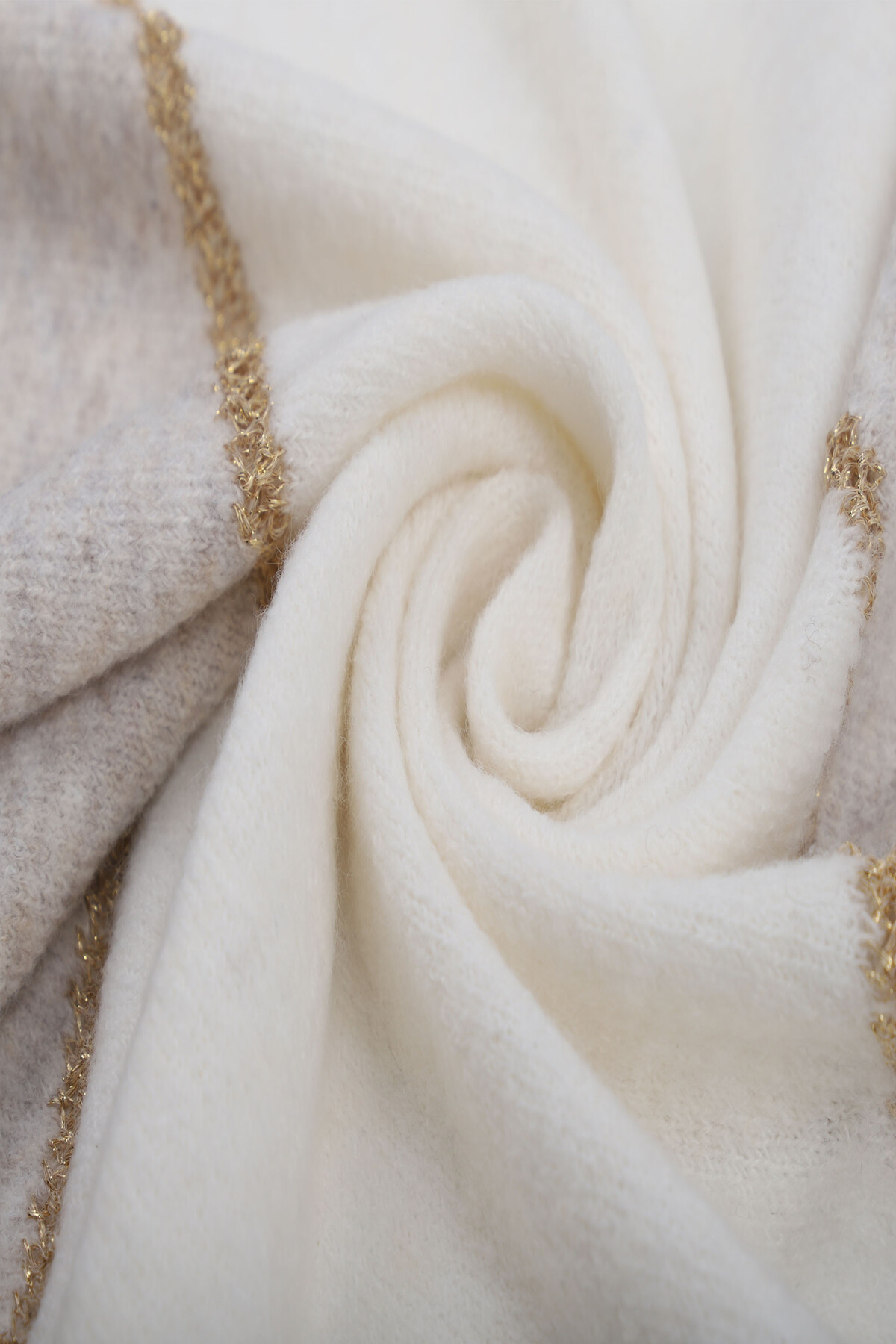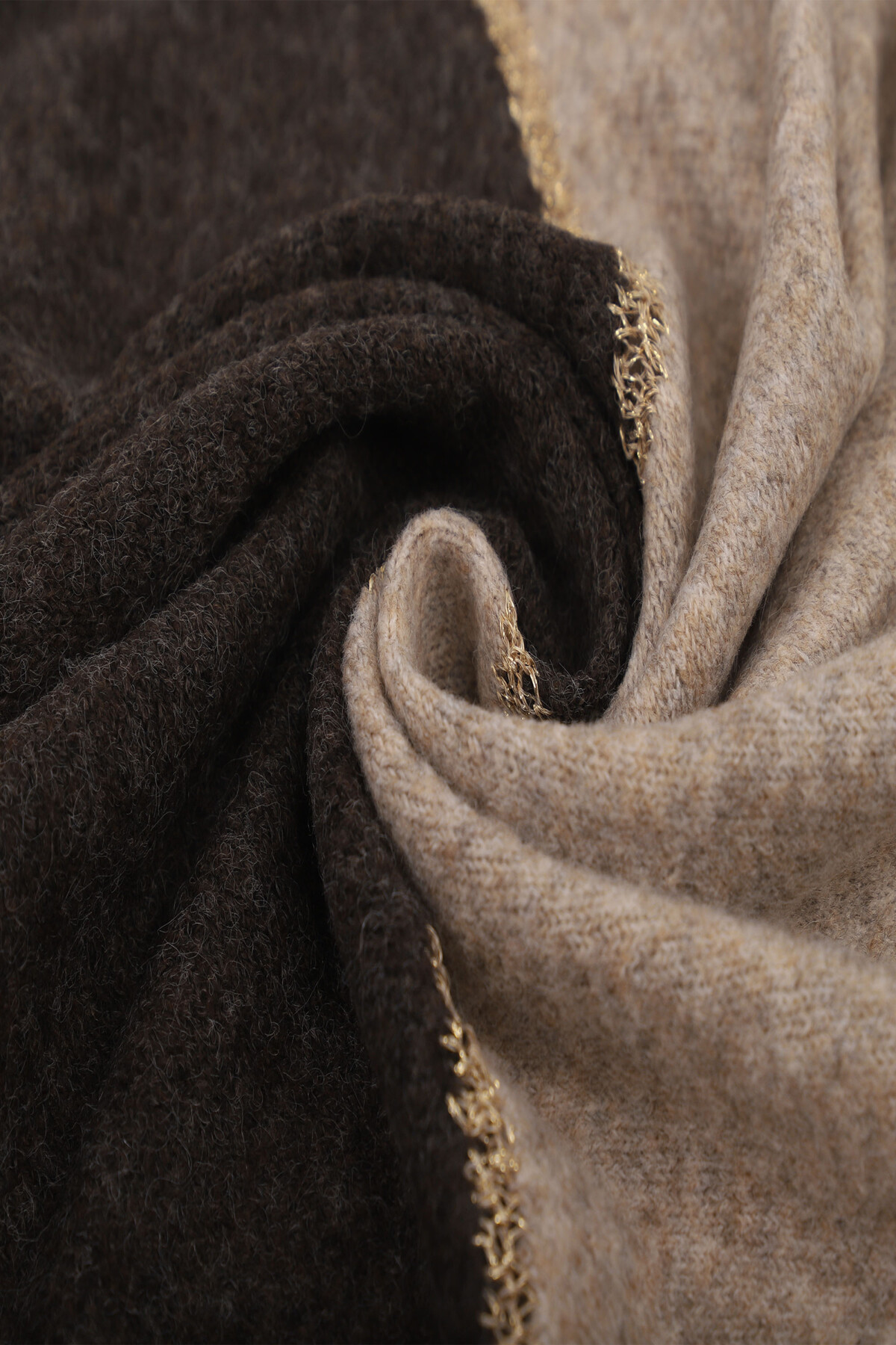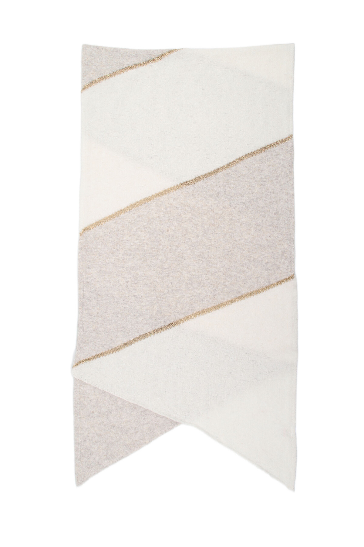 Dette tofarvede tørklæde har et spidst ende-design og patchwork-effekt. De forskellige dele er fint forbundet af en glitrende tråd.